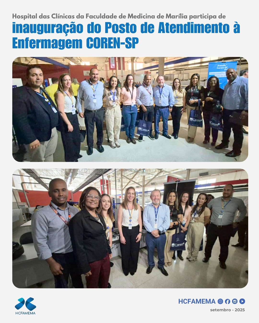Representantes da equipe de enfermagem do HCFAMEMA estiveram presentes na inauguração do novo Posto de Atendimento à Enfermagem Descentralizado do Conselho Regional de Enfermagem (COREN-SP), que ocorreu na segunda-feira, 22 de setembro de 2025. Os representantes foram: Milton Dias, apoio…