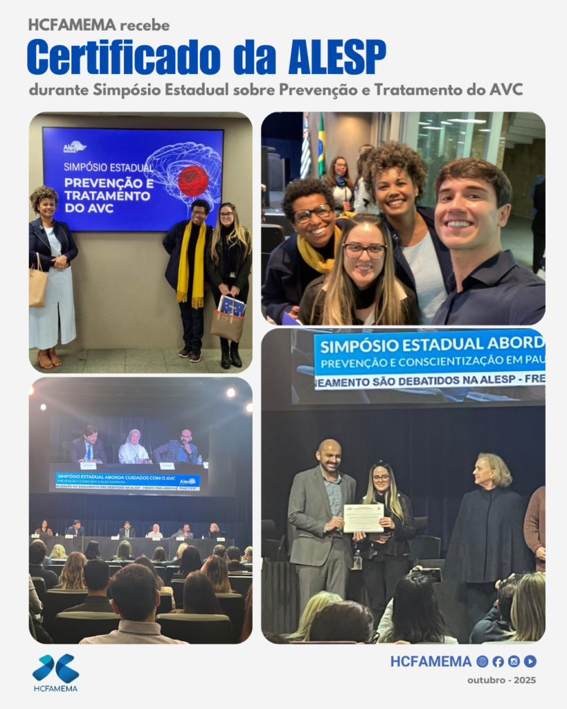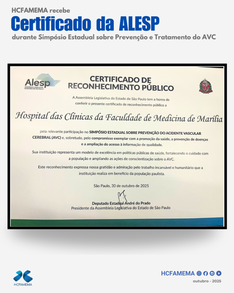 O Hospital das Clínicas da Faculdade de Medicina de Marília (HCFAMEMA) recebeu, no dia 30 de outubro de 2025, certificado pelo compromisso exemplar com a promoção da saúde, a prevenção de doenças e a ampliação do acesso à informação de qualidade durante o Simpósio sobre Prevenção e Tratamento do Acidente Vascular Cerebral (AVC), promovido pela Assembleia Legislativa do Estado de São Paulo (ALESP).